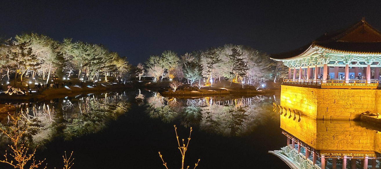 가장 먼저 추천하는 곳은 동궁과 월지(구 안압지)입니다. 이곳은 통일신라시대 궁궐 별궁의 일부였으며, 연못과 전각이 어우러진 환상적인 야경을 자랑합니다. 물 위에 반사된 조명이 마치 거울처럼 펼쳐져 사진 찍기에 제격이며, 늦은 시간까지 개방되어 있어 밤 산책 코스로도 훌륭합니다.
